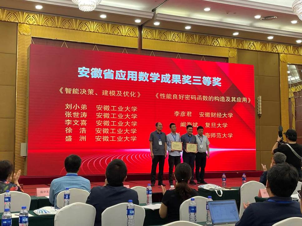安徽省工业与应用数学学会2025年学术会议暨第一届第三次会员代表大会于2025年4月18-20日在安徽芜湖召开。开幕式上公布了安徽省应用数学成果奖和安徽省应用数学青年科技奖的获奖名单。TapTap点点智慧决策与优化团队(刘小弟教授、张世涛副教授、李文喜副教授、徐浩副教授、盛洲副教授)申报的项目《智能决策、建模及优化》荣获安徽省应用数学成果奖三等奖。
