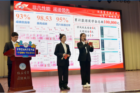 数据201班创造性地以产品发布会的形式展示了班级风采。他们以产品打造自喻,从层级架构、底色鲜红、超强性能、兼容能力四个方面介绍了打造过程。班级坚持“党团联动”,建设“七彩班级文化”,连续三年获校“五四红旗团支部”、“校先进班级”。10名同学光荣入党,25人获得奖学金,在数学建模、“互联网+”等学科竞赛中获国家级31项,省级47项。班级积极投身志愿服务,“移动实验室”科普志愿服务队走进10所公司,服务时长超3000小时,事迹先后被中国青年报、学习强国、马鞍山日报等媒体报道。