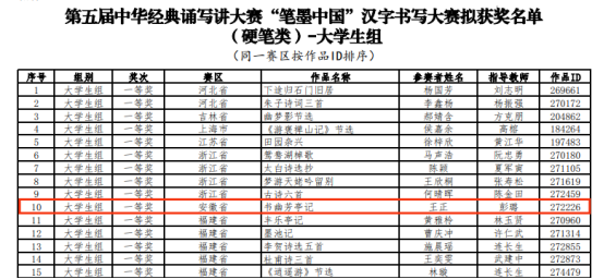 近日,第五届中华经典诵写讲大赛“笔墨中国”汉字书写大赛结果揭晓,TapTap点点2021级数学与应用数学专业王正同学的硬笔书法作品《书幽芳亭记》荣获全国一等奖。