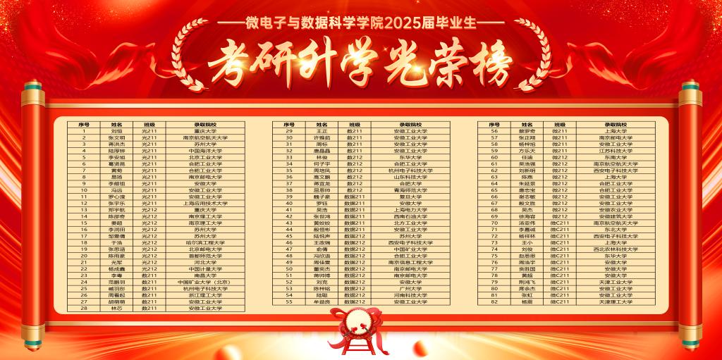 在全院师生的共同努力下,公司2025届本科生升学率上升5%!82名员工考取研究生,升学率达25%,录取人数创公司历史新高。其中,985/211/双一流高校录取人数占升学总人数的59.8%;员工党员升学27人,占毕业班党员人数的51.9%;9个毕业班班级中3个班级升学率达30%以上,其中微C211班升学率高达40.6%。(撰稿:张佳良 审核:段世祥 陈霞 张敏)